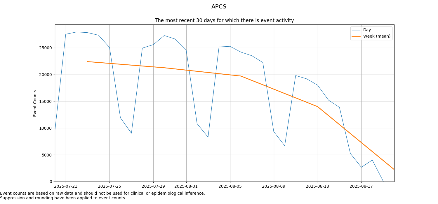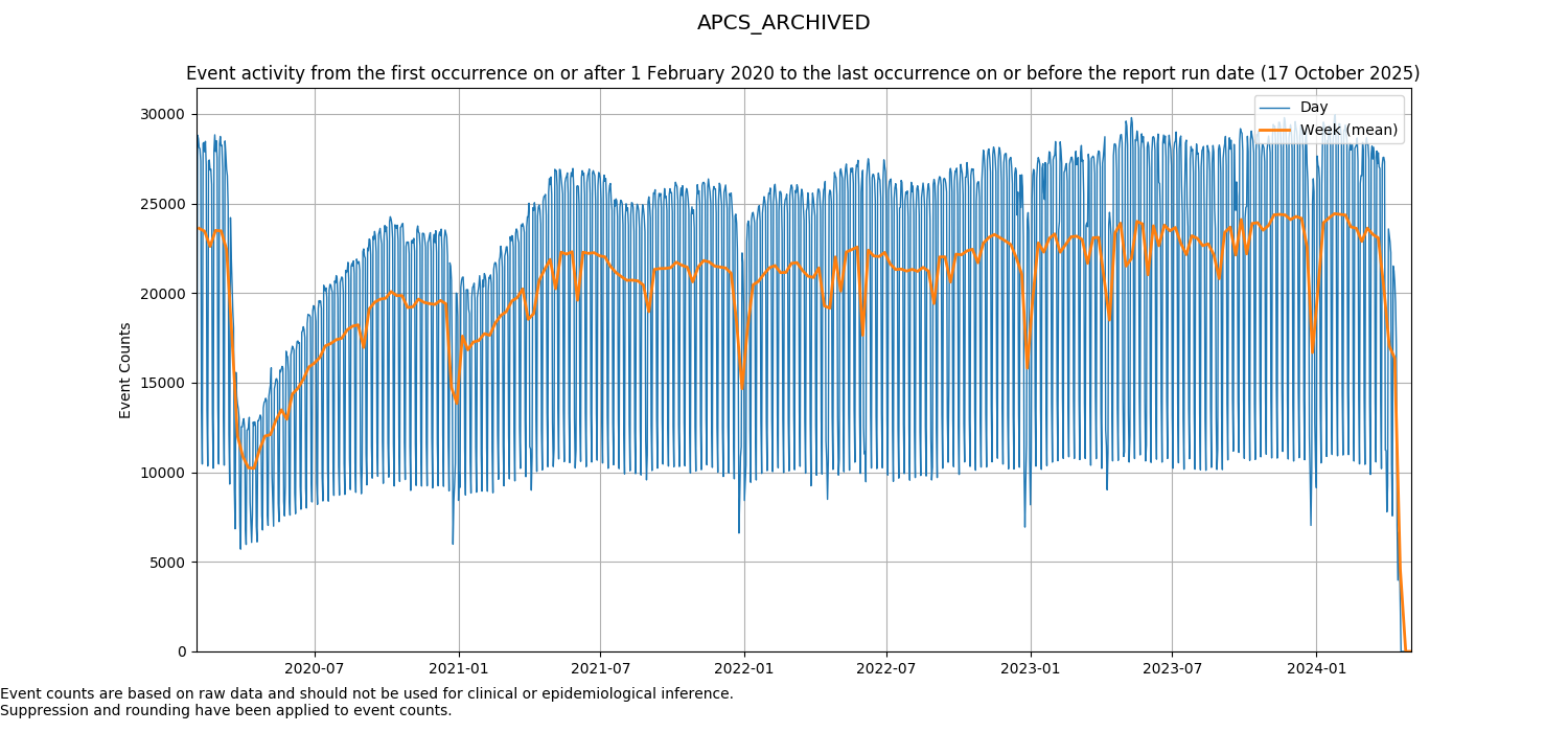 The APCS data comes from two underlying database tables. APCS contains data from March 2022 onwards while APCS_ARCHIVED contains data up to March 2024 - NB these tables overlap. This complexity is hidden from users via ehrQL which combines the two tables to provide a single view of the data. However for completeness the plots for both tables are shown below.