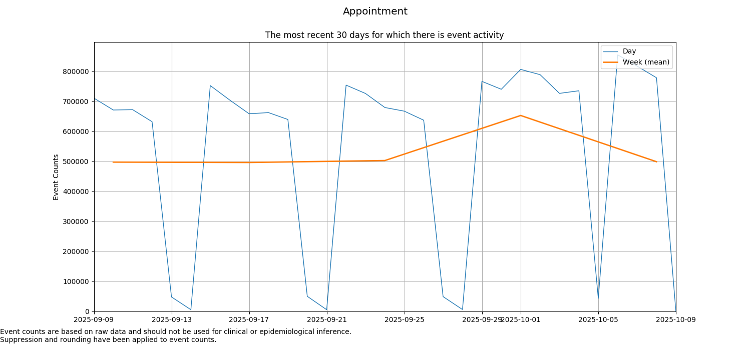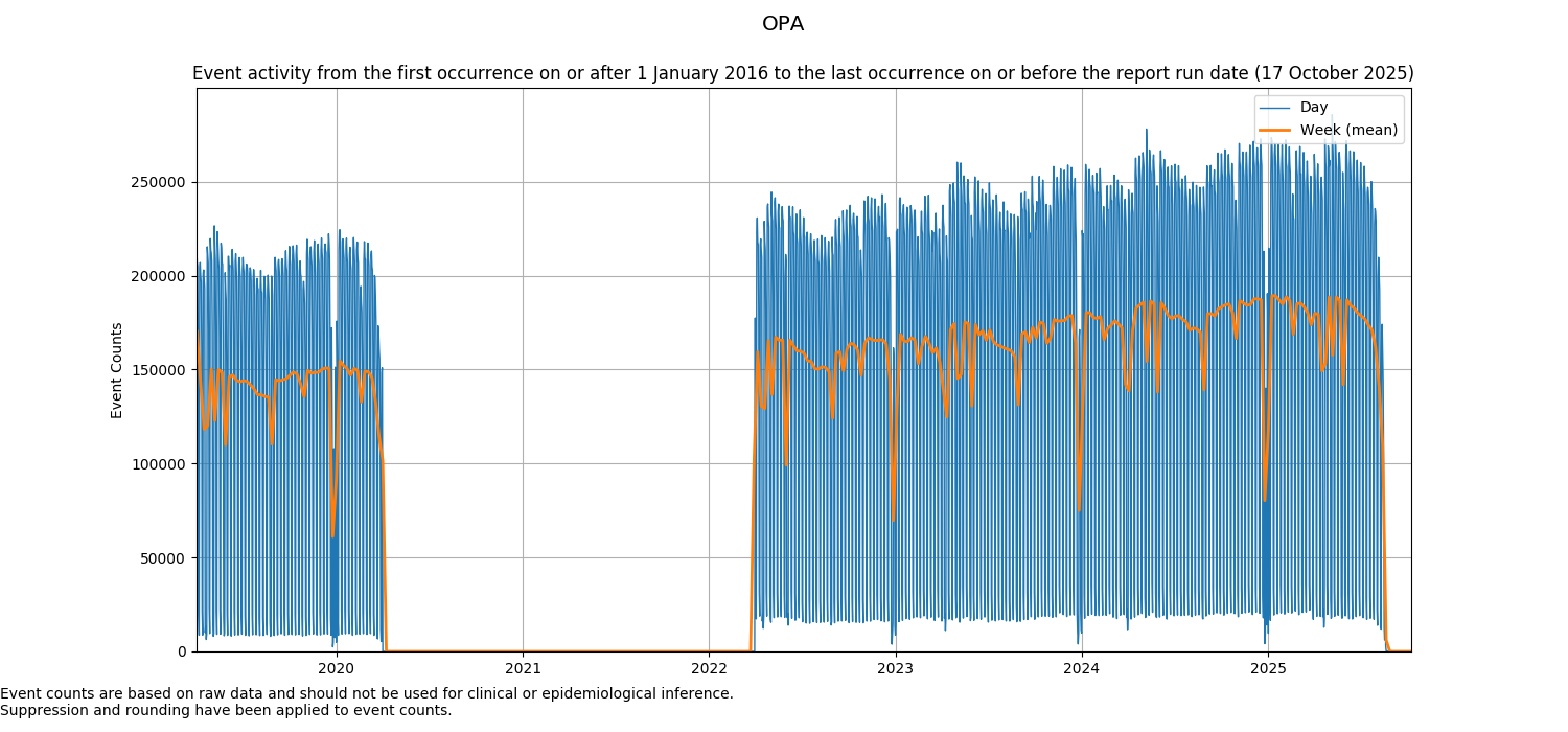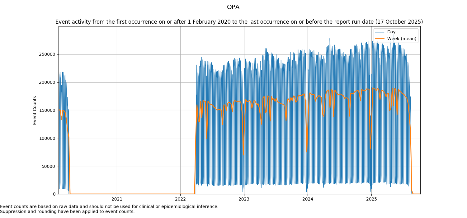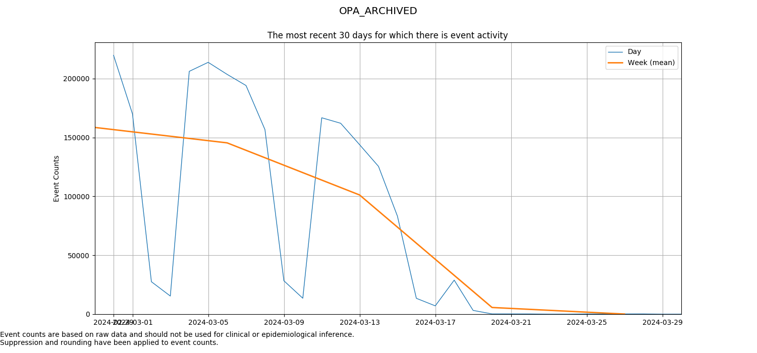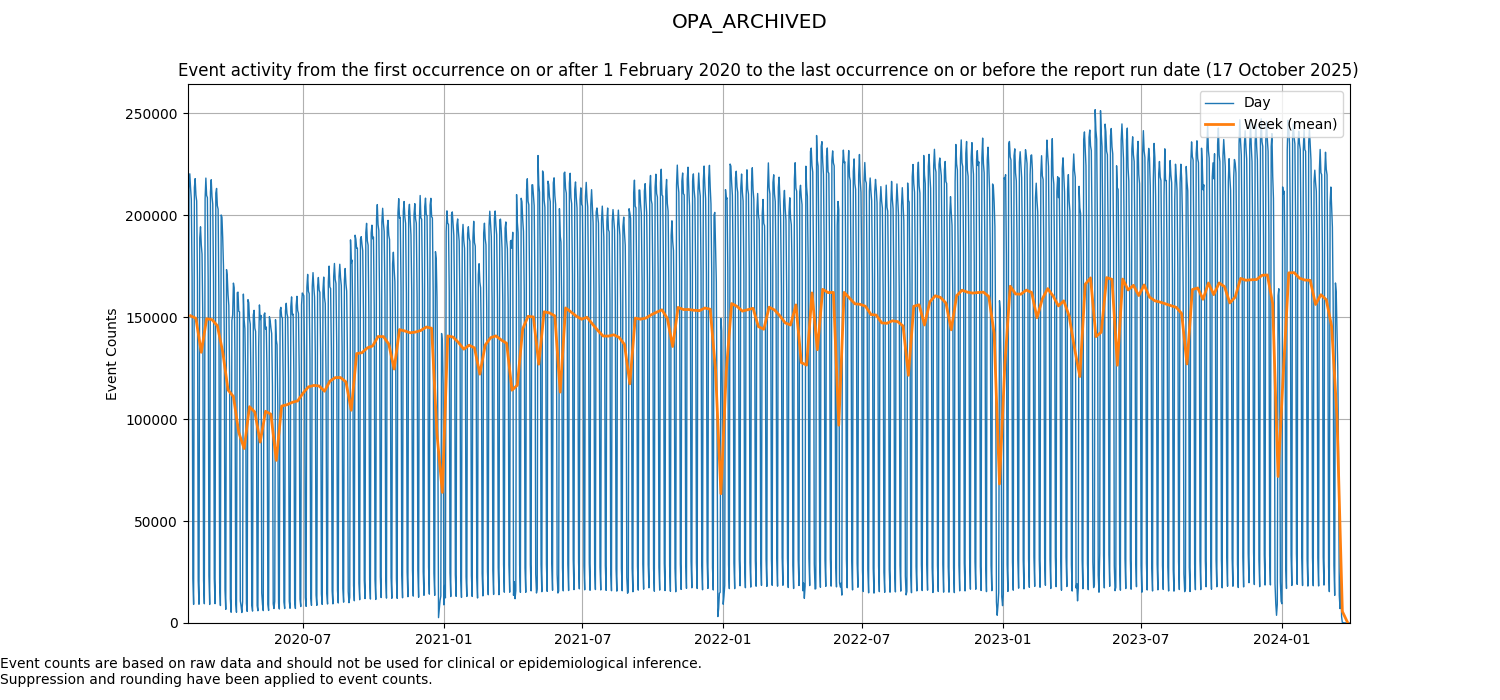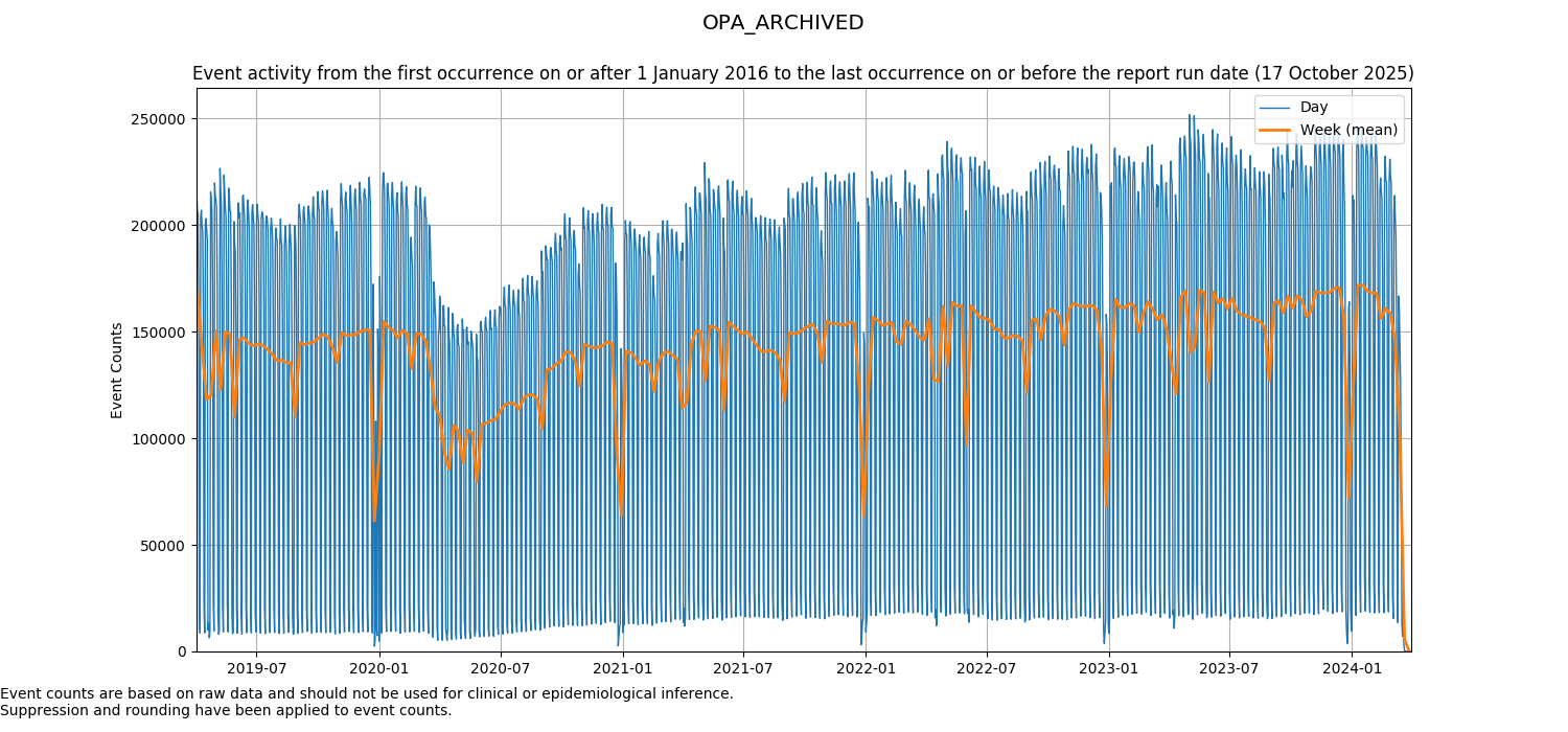 The OPA data comes from two underlying database tables. OPA contains data from March 2022 onwards while OPA_ARCHIVED contains data up to March 2024 - NB these tables overlap. This complexity is hidden from users via ehrQL which combines the two tables to provide a single view of the data. However for completeness the plots for both tables are shown below.