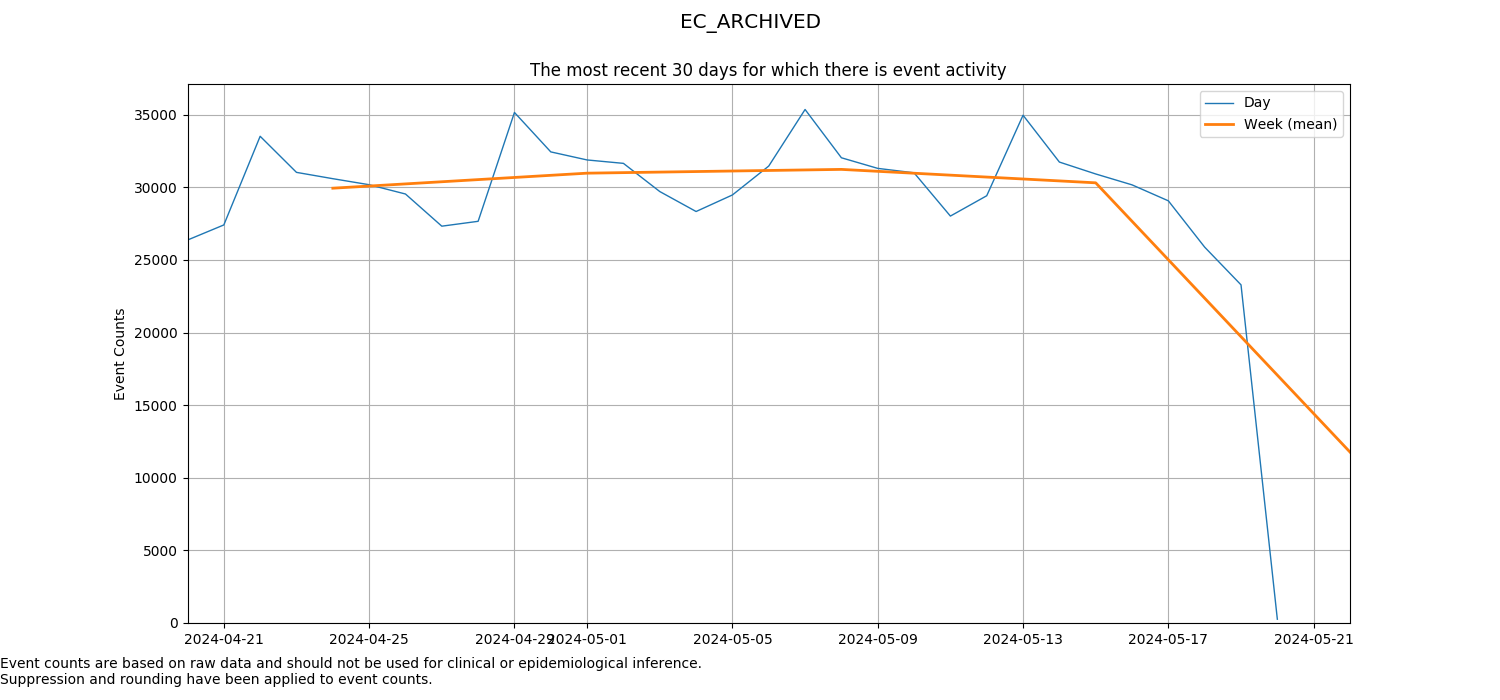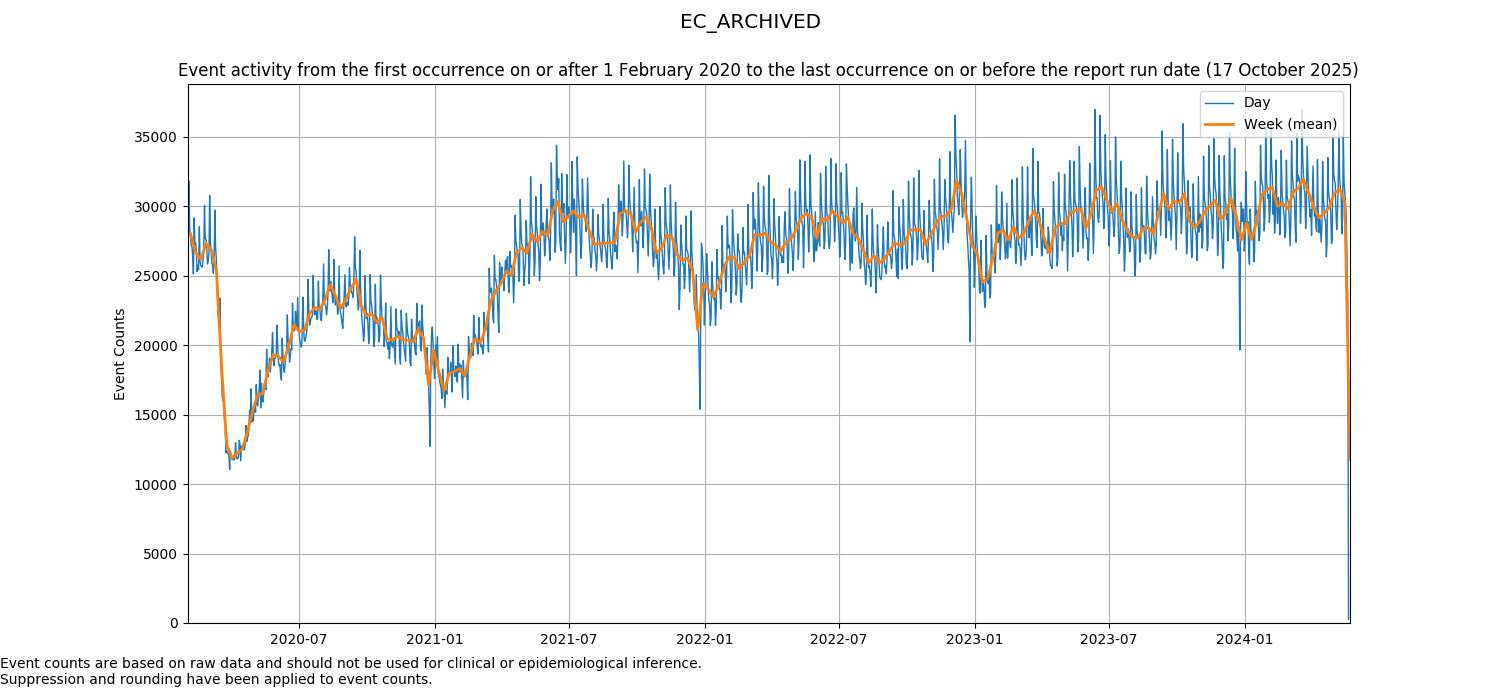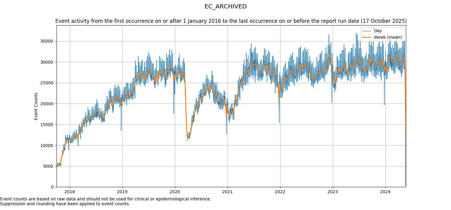 The EC data comes from two underlying database tables. EC contains data from March 2022 onwards while EC_ARCHIVED contains data up to March 2024 - NB these tables overlap. This complexity is hidden from users via ehrQL which combines the two tables to provide a single view of the data. However for completeness the plots for both tables are shown below.
